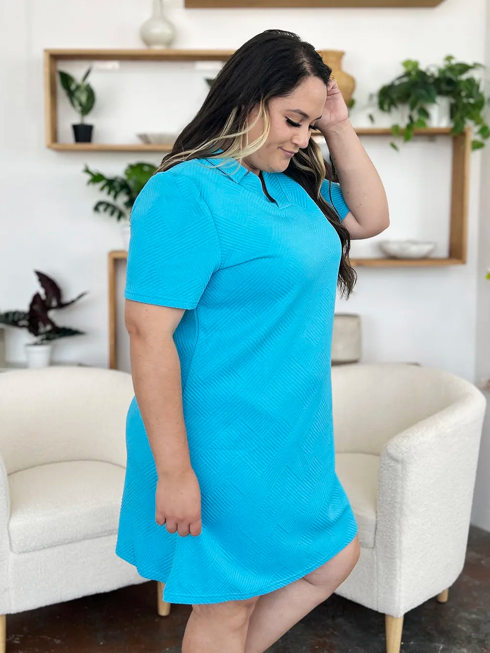 Double Take Full Size Texture Collared Neck Short Sleeve Dress